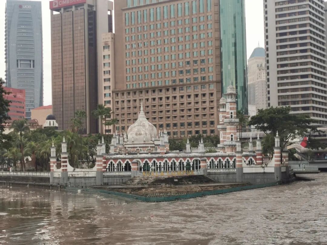 巴生河上的占美清真寺,仿佛在湍流的河面上漂移。