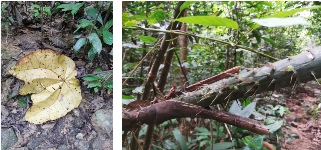 靠着远方巨大的机器轰鸣声指引,我找到了一条新路,但绕了一大圈后发现回到了原来的路上。重走老路稍微放松,注意到了槭叶翅子树的巨大枯叶、柳条省藤的红色尖刺。