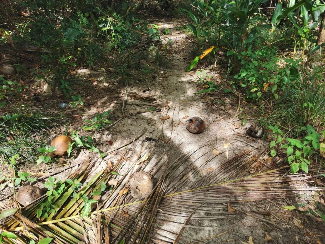 返程时选了一条新路线,入口四散的椰子壳像骷髅一样,让氛围变得阴森。不远处还有大红蚂蚁在路上排成人字形来回穿梭,仿佛赶着进行某项仪式。