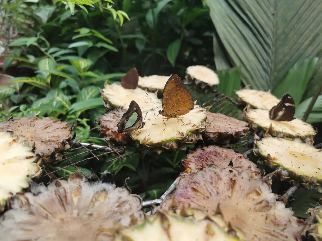 园中有不少用菠萝切片、茱萸花吸引蝴蝶的铁架。