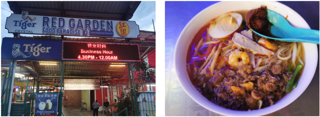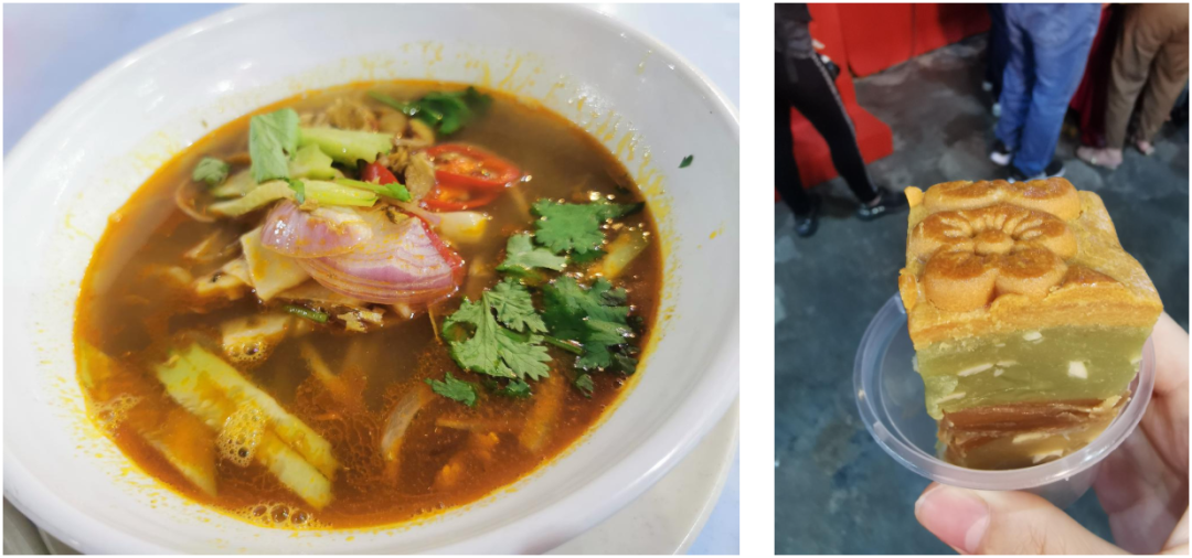 两旁的店很多中文,但不少店主是马来人。吃了其中一家的叻沙,酸辣味道浓郁,就着派发的月饼吃刚刚好。