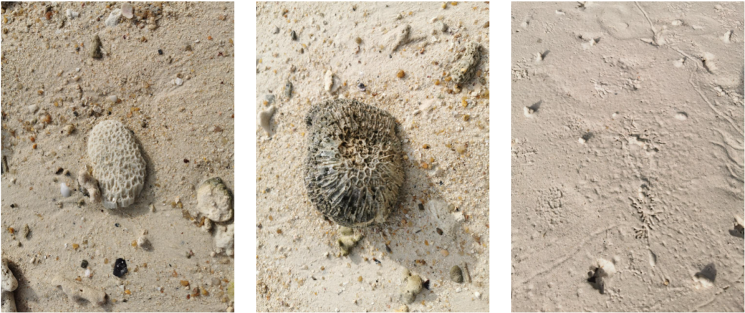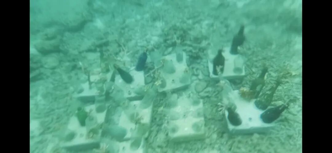 还有一片海岸整齐摆放了大片塑料瓶,每个瓶口插一两枝珊瑚,看起来像个祭坛。