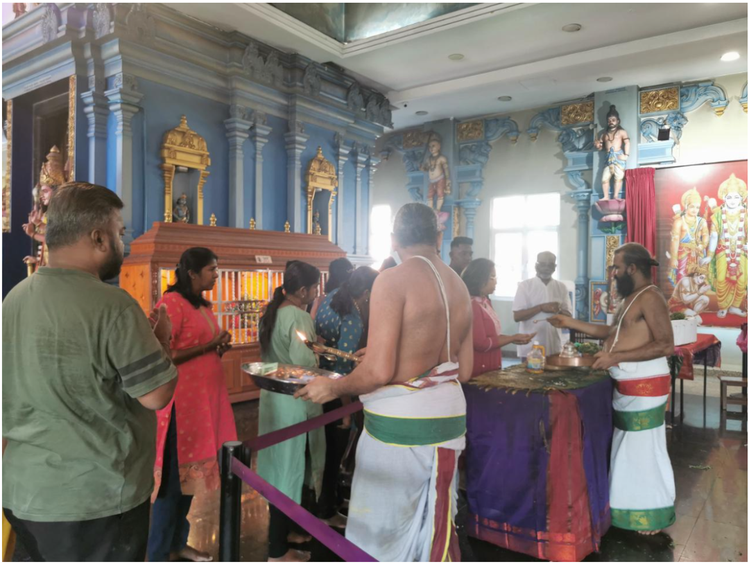 庙内,光膀子的祭司正在举行普迦仪式。他边吟唱边用金盏菊、罗勒叶装饰神像,唱完后端着带燃灯的托盘到信徒前,信徒布施后轻触火苗再摸眼睛,代表接受神赐予的力量与智慧。之后祭司再舀一勺圣水到信徒掌心,信徒喝掉后便完成了赐福仪式。
