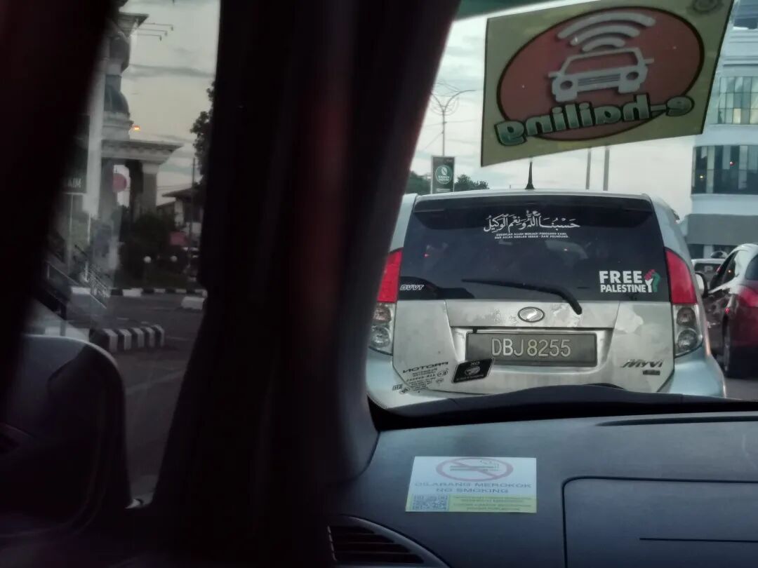 一辆车的后窗有“解放巴勒斯坦”的贴纸,这在“伊斯兰城”哥打巴鲁不罕见。